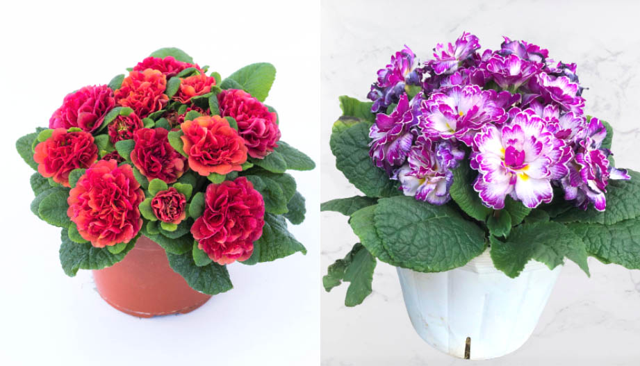 イギリスのデビッドカーリー氏によって育成されたイングリッシュプリムローズ。花型はバラ咲きタイプとは異なったパーフェクトな美しい八重咲き。メリクロン培養苗なので、草姿や花色は品種毎で安定している。ロゼット状の株の中心から株全体を覆うように多数の花芽ができる。タネがつかない品種の為、花持ちは非常に良い。一般的なプリムラに比べ、耐寒性や耐暑性に優れ、関東以南の暖地であれば戸外で宿根草として栽培できる。3.5号ポット仕立てから5号前後の鉢物仕立てにも向いている。