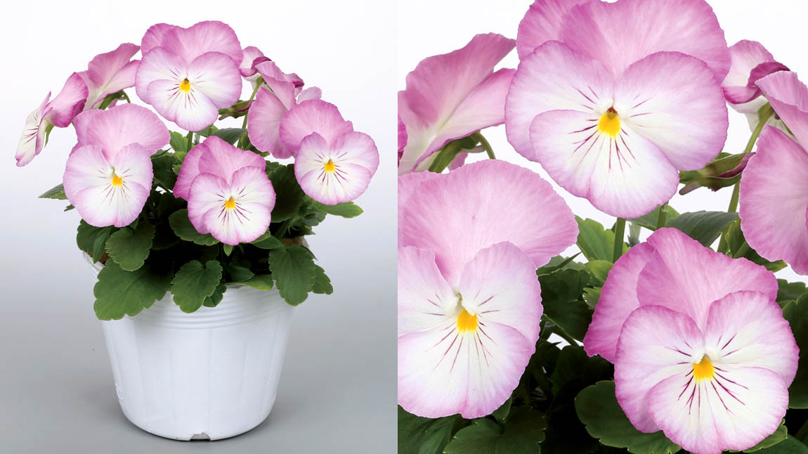他のパンジーにはないユニークな、虹のような花色が美しいプレミアム品種。中輪系で連続開花性に優れ次々に開花。高温期の栽培には草姿がコントロールしにくい点があるので、後期出荷向き。※全品種に色幅があり、覆輪とならない単色の個体が発生することもあります。