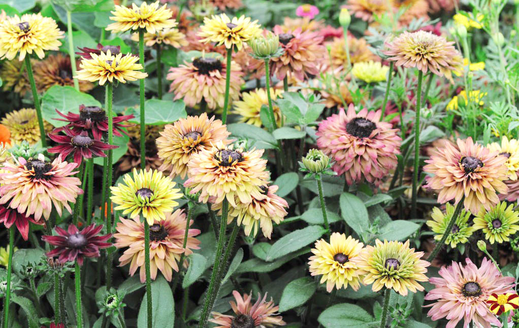 夏花壇向けに人気のルドベキア。アンティーク系の花色ミックス。草丈50~55cm程度のため、ポット出荷でコンパクトに収めたい場合は矮化剤処理が必要。