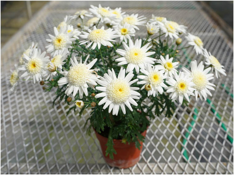 舌状花は純白で、管状花の集まる中心部は淡いバニラホワイトのアネモネ咲き。分枝が良くコンパクトに生育し、3.5~5号ポット向き。