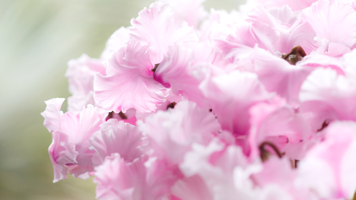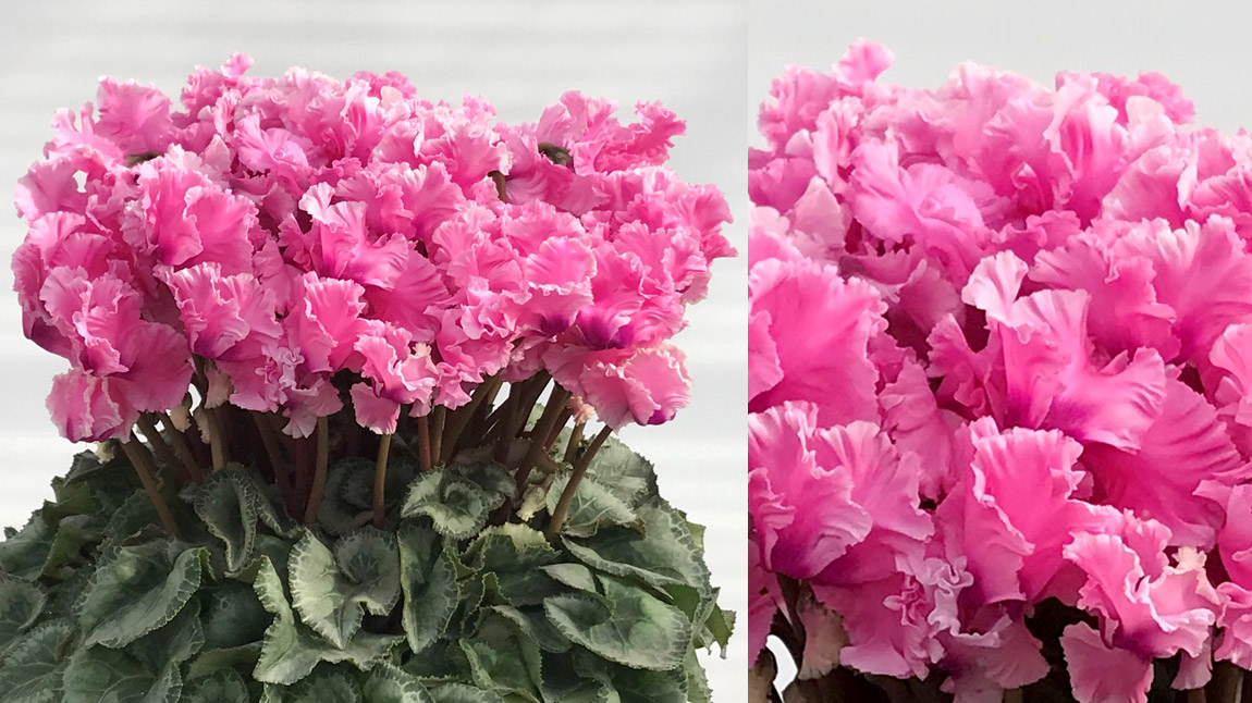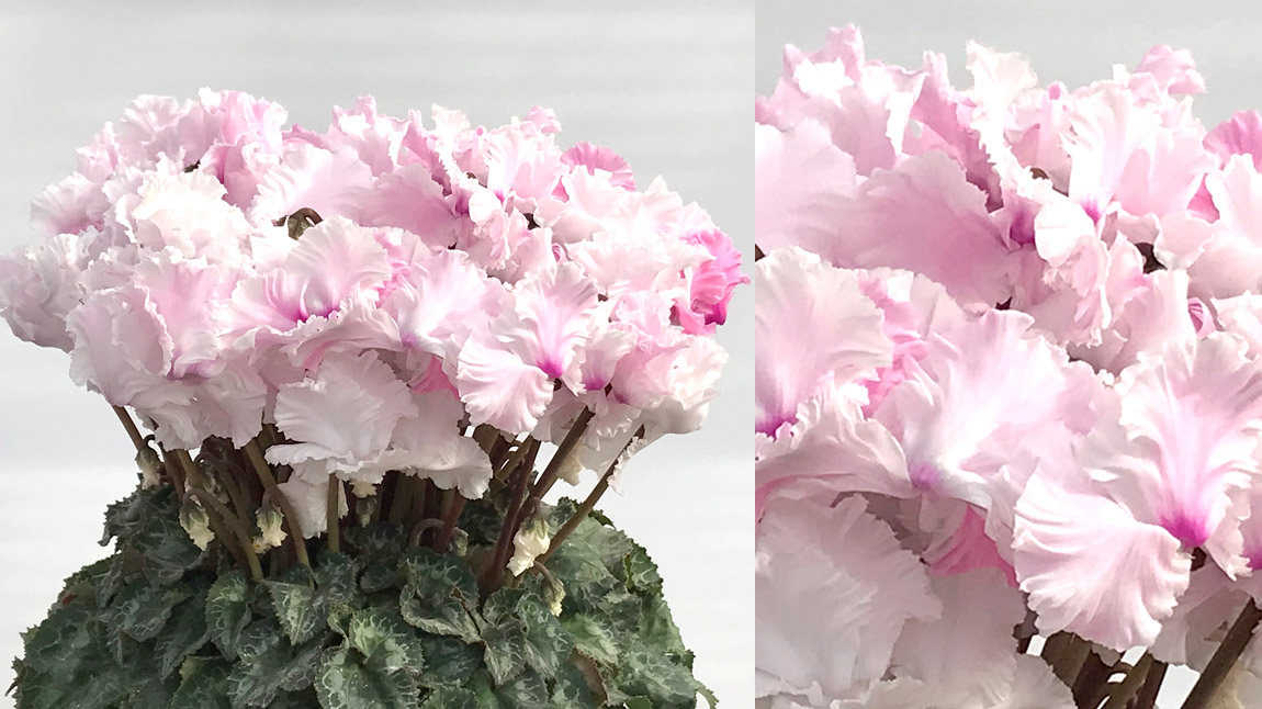 大栄花園育成のF1パステル品種。キャンディーケーンは、赤~ピンク、白のストライプ模様のグラデーションに優しいフリルが入り、クリスマス装飾の中に赤と白に彩られた杖の形をしたキャンディをイメージした花色・花型。作り易くギフト作りからカジュアルなセミミニ作りまで対応でき、4~6号鉢仕立て向き。※花色には個体差がありますので予めご了承ください。
