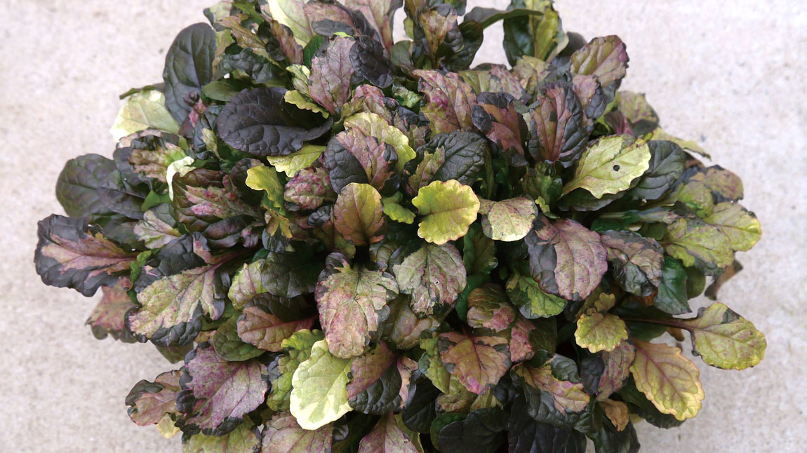 弊社育種のオリジナル品種。クリーム・グリーン・バーガンティ等の斑が複雑に入りとてもユニークな色合い。低温期には全体的黒味が増し独特な色合いになります。春にはパープルブルーの花を開花。一般的なアジュガに比べて差別化ができ、ワンランク上の価格が期待できます。3.5号ポット出荷向き。