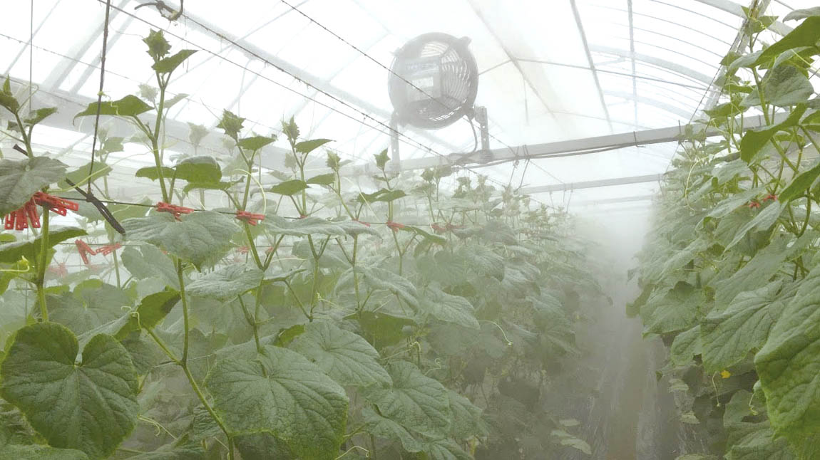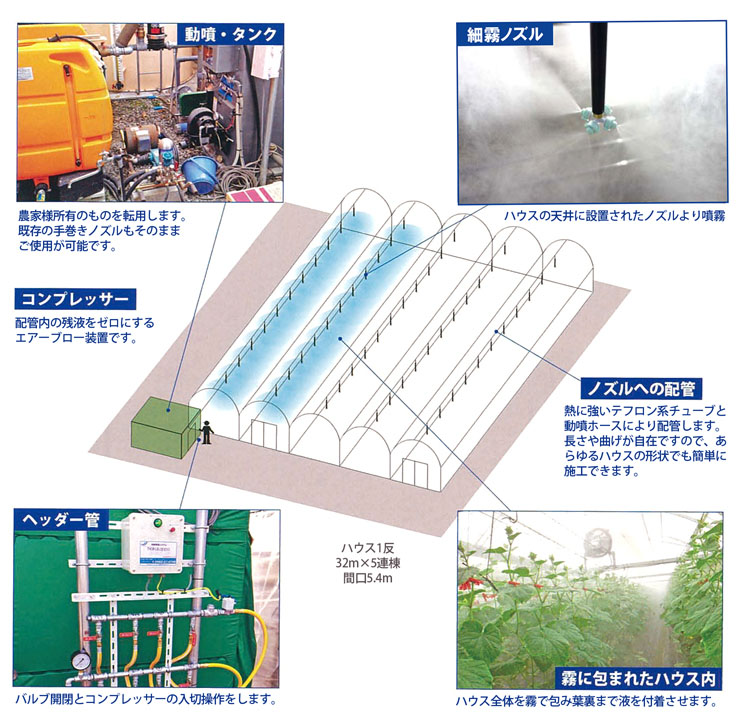 ハウス植物栽培には病害虫対策として薬剤散布は欠かせませんが、散布作業の負担は軽くありません。「なからっぽ」自動噴霧システムは細霧ノズルが4方向に噴射、平均粒子65ミクロンの霧でハウス全体を包みます。このため、かけにくい葉裏やハウスの隅にも薬剤が行き渡り、効果的な防除が可能になります。噴霧後は配管内の残液をエアーブローで空にする「なからっぽ」独自のシステム(実用新案取得)により、残液による混合やノズルの詰り、配管内のコケや藻等の発生を防ぎます。薬剤散布のみならず、細かい霧状にした散水をすることにより、夏季のハウス内の冷却効果も期待できます。また、液体肥料の葉面散布にも利用できます。配管はフレキシフルな耐圧チューブ・ホース等の使用により、特殊な技術を要しなくとも短期間で容易に工事することが出来ます。このため、設置のための費用を比較的安価に抑えることが可能になります。
