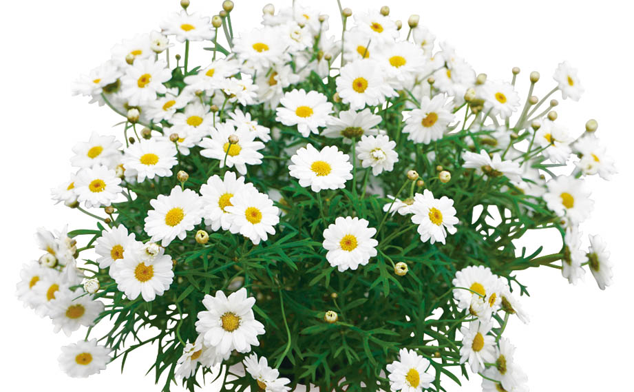 鮮やかな純白の花。連続開花性が高く、花老けしにくい性質で、株全体を花で覆うように開花。4~6号向け。普通のマーガレットとは少し違うカモミールに似た可愛い花の形。