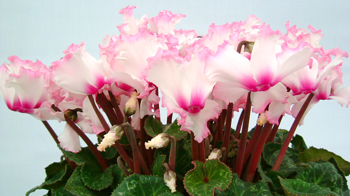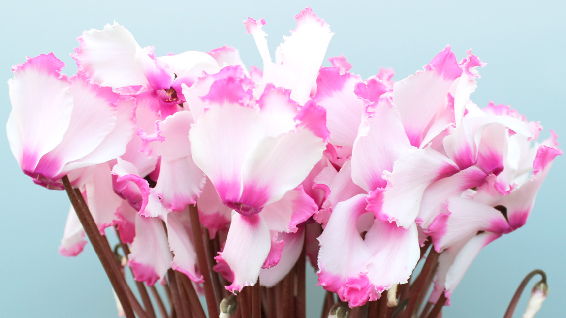 林園芸育成の変わり色ビクトリア。ラダムエレガントは、白地の花弁でフリンジ部がサーモンピンク。ラフィーユエレガントは、白地の花弁でフリンジ部が鮮やかなピンク。5~6号鉢物仕立てにすると、ボリュームある豪華な鉢物になり、ギフト需要に最適。