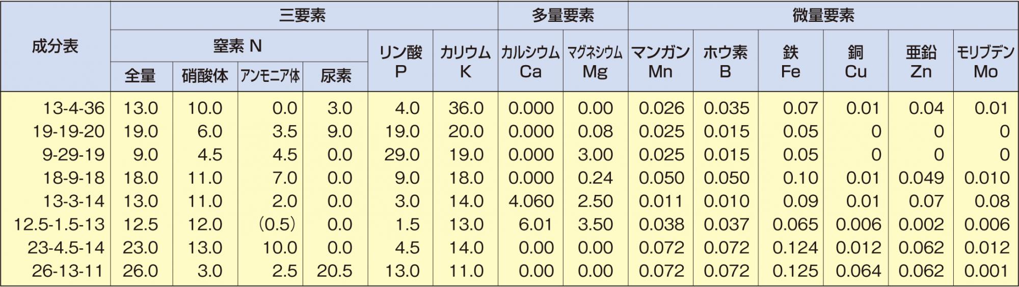 | 12.5-1.5-13 | 1,300倍 | 650倍 | 433倍 | 325倍 | 260倍 | 窒素量を13%として計算 |