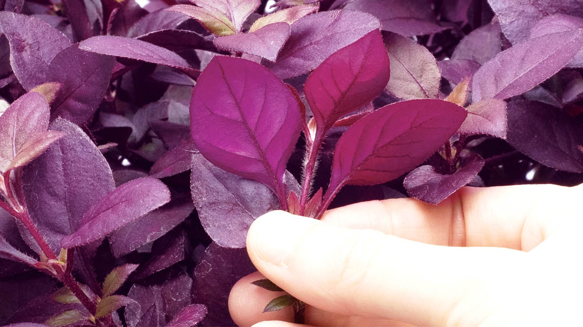 生育旺盛な栄養系アカバセンニチコウで、季節ごとの葉色の変化が楽しめるカラーリーフ。初夏~夏に伸びる新芽のグリーンと全体のパープルのコントラストが美しい。秋、涼しくなるにつれて葉色は一層濃いパープルに変化する。直射日光に強く、花芽が付きにくい性質で、栄養成長が継続するので長期間観賞できる。プラグ苗から2回ピンチで3.5~4号ポット出荷まで10週間。