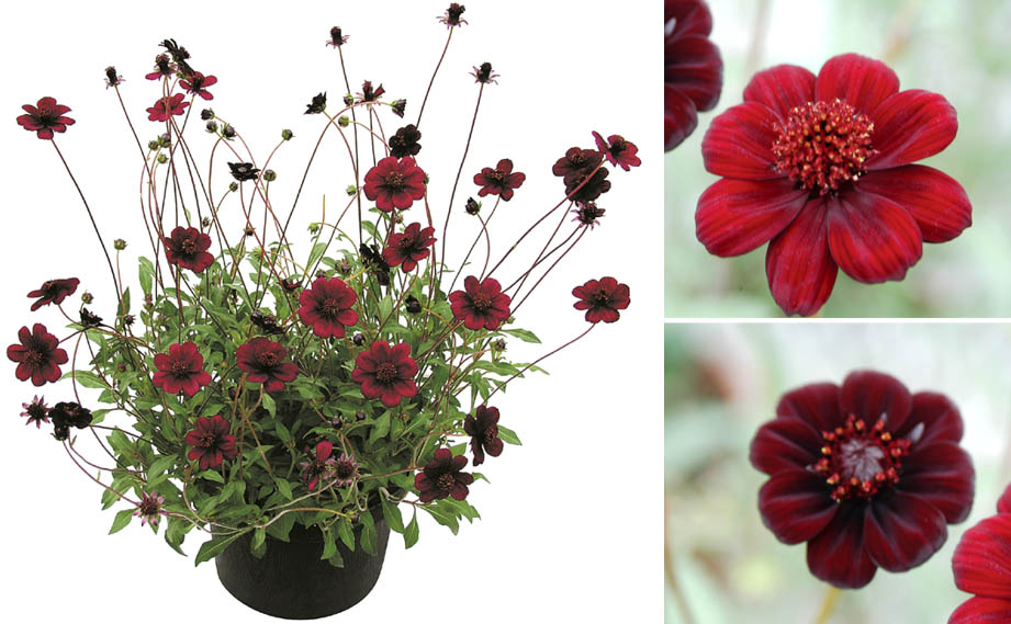 真夏の高温、直射日光にも耐える耐暑性のあるチョコレートコスモス。花はベルベット調の赤みのある茶色で香り高い。従来種に比べるとコンパクトに生育し、圧倒的に分枝性が良く、花数も非常に多い。ポット仕立てとして非常に作り易く、短期間でボリュームある株となる。3.5号以上の仕立て向きで、プラグ苗から2回ピンチで約11週が出荷の目安。